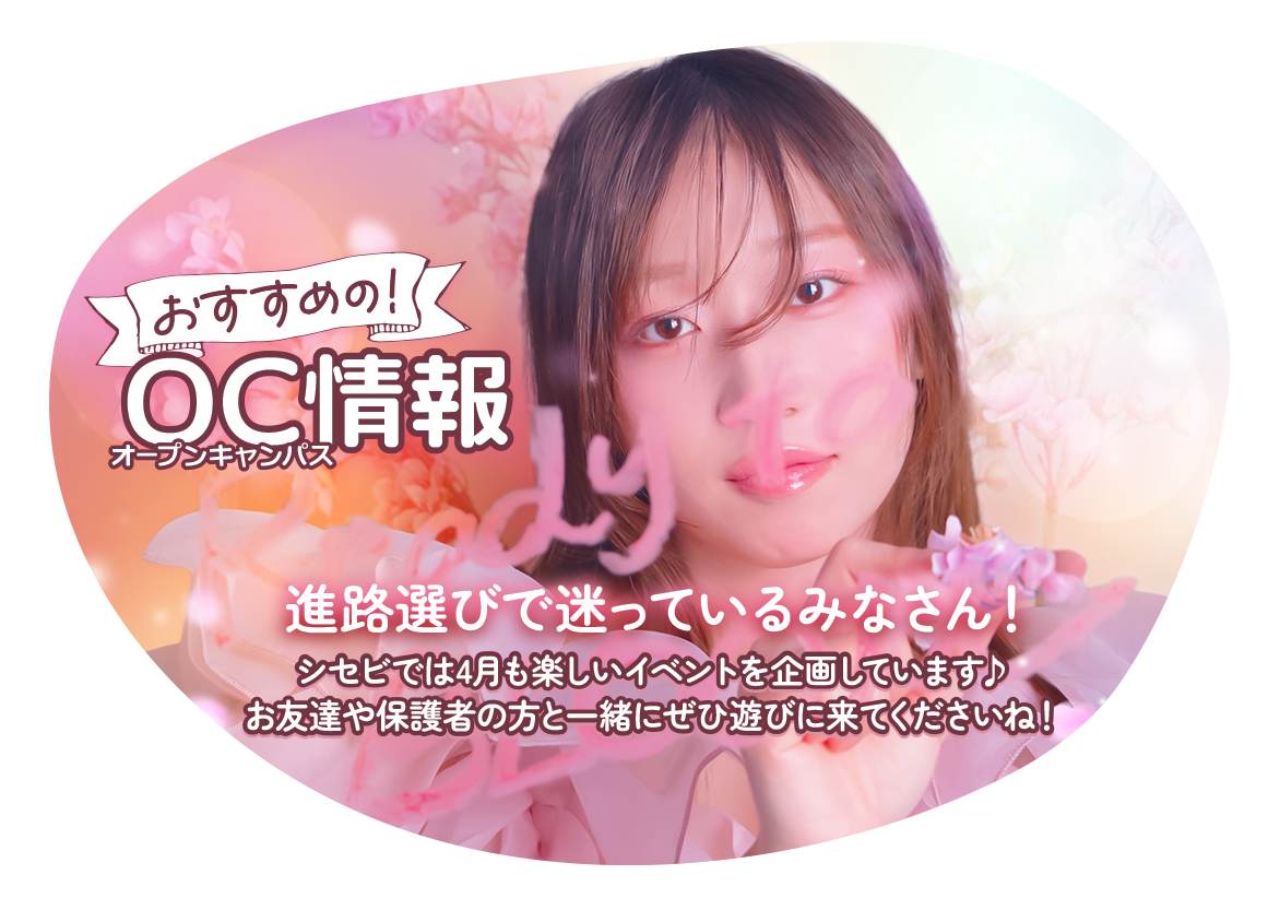 - 2027年4月入学生は、2月以降シセビのオープンキャンパス、オンラインオープンキャンパス、学校見学いずれかの参加が受験の条件になります。